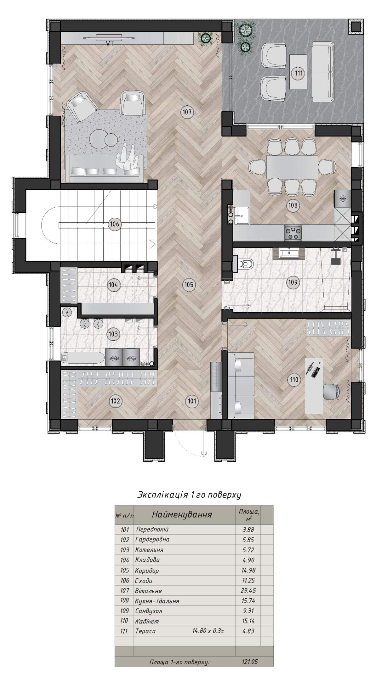 Вікна та вітражі – металопластикові – 6-камерні, мультифункціональні з енергозбереженням взимку та сонцезахистом влітку, в зоні патіо – розсувні системи